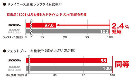 高剛性ハンドリングシート、S007A専用サイド補強、S007A専用コンパウンドを採用することでドライ路面でのハンドリング性能の向上を実現しています。