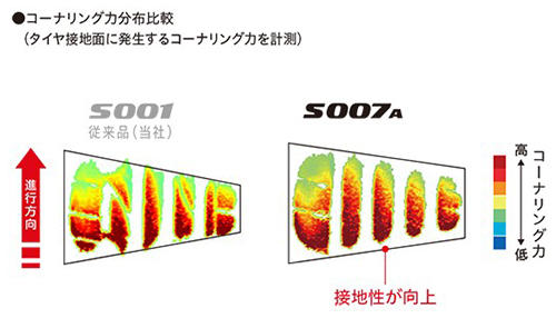 「POTENZA S007A」は、運動性能を重視する数々のハイパフォーマンスカーに新車装着タイヤとして採用され市販用タイヤとしてもグローバル展開している「POTENZA S001」の後継商品です。「POTENZA」の特徴であるドライ性能を更に向上させるとともに、ウェット性能とコンフォート性能にも配慮したタイヤです。また、当社のグローバル商品として日本のみならず北米・アジア各国でも順次販売します。