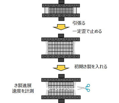 長方形のゴムシートを長手方向に掴み、高さ方向に所定の歪まで伸長し、歪を固定する(所定の引裂きエネルギー※3を与える)。そこで試験片の片側面に初期き裂を導入し、き裂の進展速度を高速度ビデオカメラなどを用いて解析する。
