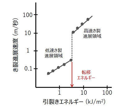 図1の試験で与えた引裂きエネルギーでのき裂進展速度をプロットすると、ある(転移エネルギー)でき裂進展速度が増大する。本プログラムでは、この転移エネルギーをゴムの強度としている。
