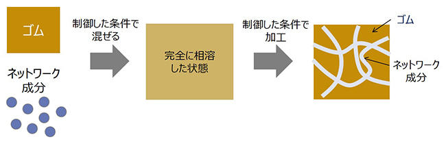 本研究開発課題では、強靭な高分子複合体を実現し、そのメカニズム解明等の技術基盤を確立するとともに、省資源タイヤ等への応用の端緒を得ることに取り組んでいます。