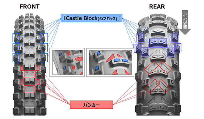 本商品は、オフロード用タイヤ開発で培った経験と技術を活かし、エンデューロレースで求められる様々な路面での高いトラクション性能とコーナリング性能を追求したタイヤです。当社の独自技術「Castle Block(凸ブロック)」を採用することで、滑りやすい路面でのグリップ力を確保するとともに、ブロック底に特殊なエッジ(バンカー)を配置することで、軟らかい路面においても高いトラクション性能を発揮します。さらに、各ブロックの形状や配置を3Dシミュレーションで最適化することで、フロントタイヤのコーナリング性能及びリアタイヤのトラクション性能の向上を追求しています。
