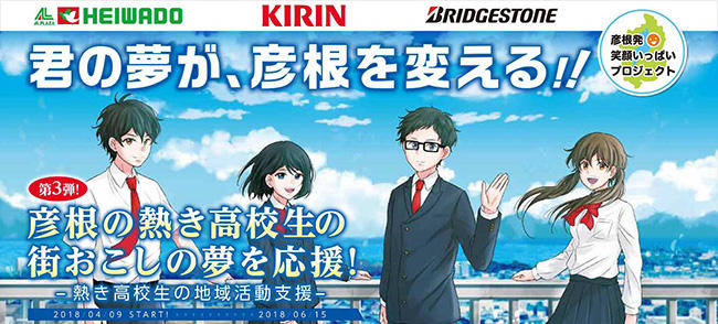 彦根創業の平和堂、彦根市に拠点を持つキリン及びブリヂストンは、地域を笑顔にする取り組み「彦根発 笑顔いっぱいプロジェクト」を連携して実施しています。その一環として街づくりの次世代リーダーとなる高校生が「地域資源を生かした活動」や「地域の課題解決に繋がる活動」等を企画し、その実現までのプロセスを3社がサポートする企画を2016年より開始しました。