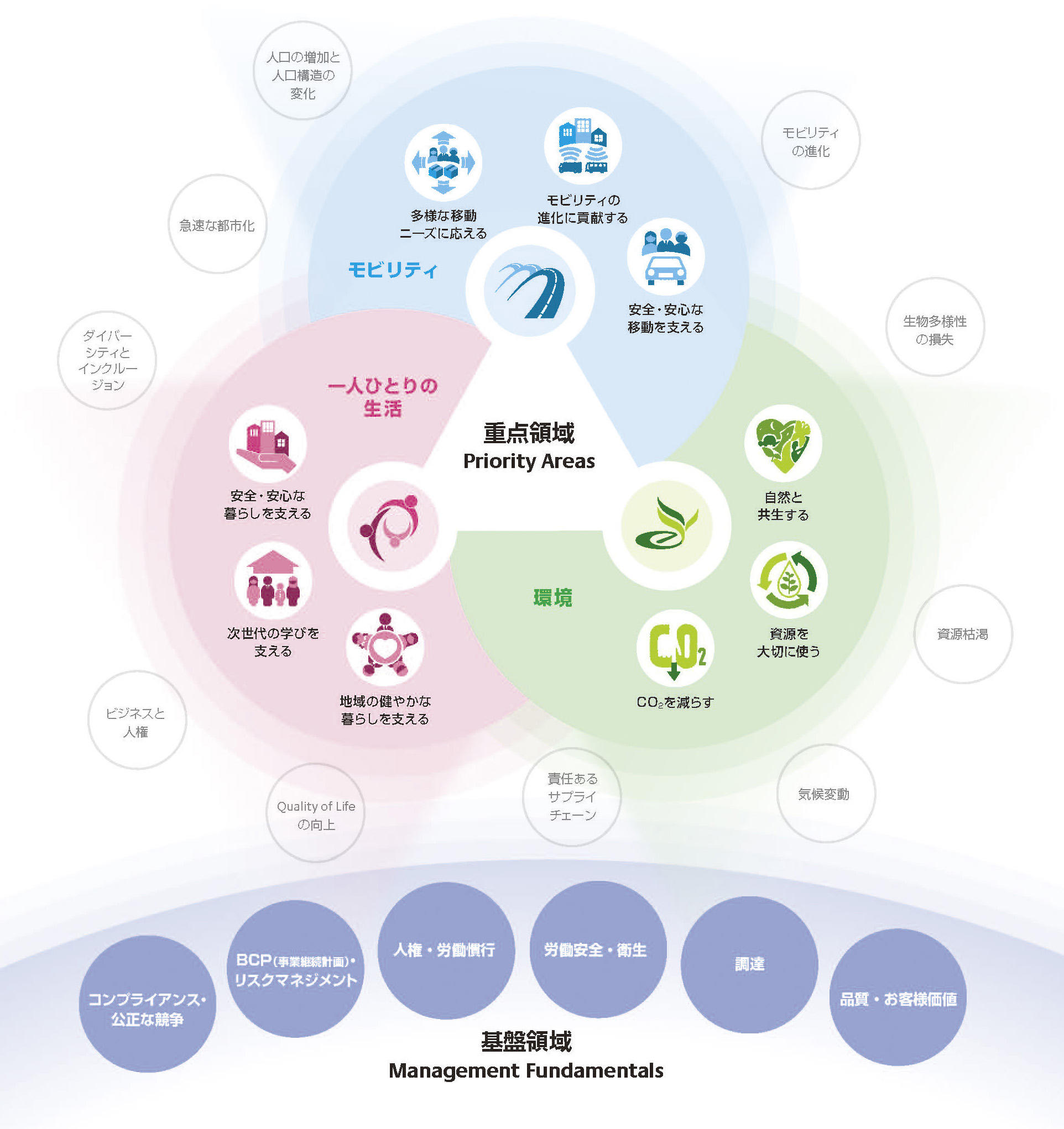 当社グループは、2017年3月にグローバルCSR体系「Our Way to Serve」を始動しました。「Our Way to Serve」では、イノベーションと先進技術を通じて、人々がより快適に移動し、生活し、働き、そして楽しむことに貢献していくために、「モビリティ」「一人ひとりの生活」「環境」の3つの領域を「重点領域(PA: Priority Areas)」として定めています。また、責任ある企業として欠かせない取り組みを「基盤領域(MF: Management Fundamentals)」とし、調達や人権・労働慣行などの6つの領域においても先進的な活動を進めています。