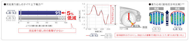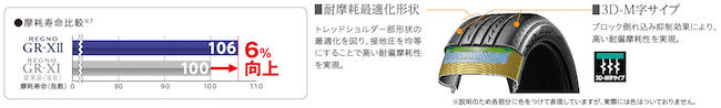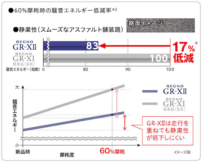 イ)通常は、タイヤの摩耗度に比例して大きくなるノイズに対し、GR-XⅡは新たなトレッドパタン技術を開発し、摩耗時でも高い静粛性を維持しています。