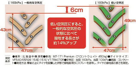 1.低内圧化によるけん引力向上、土踏み固め抑制