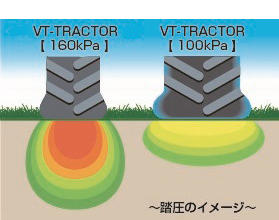 そのような市場環境にあわせて今回発売する「VT-TRACTOR」は、高耐荷重に対応したVFタイヤ※1準拠品です。更には、より低い空気圧でご使用いただくことも可能となり、タイヤが柔軟にたわむことで、地面と接する面積が増加し、けん引力の向上や乗り心地の改善、更には大切な田畑の土壌の踏み固め抑制に貢献するタイヤです。
