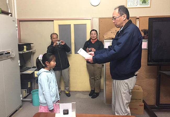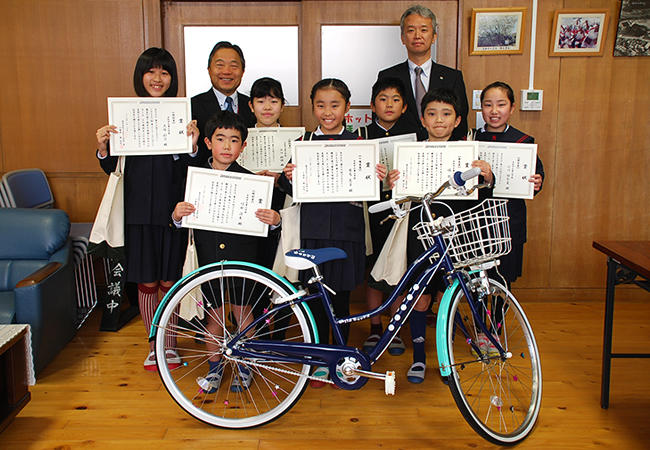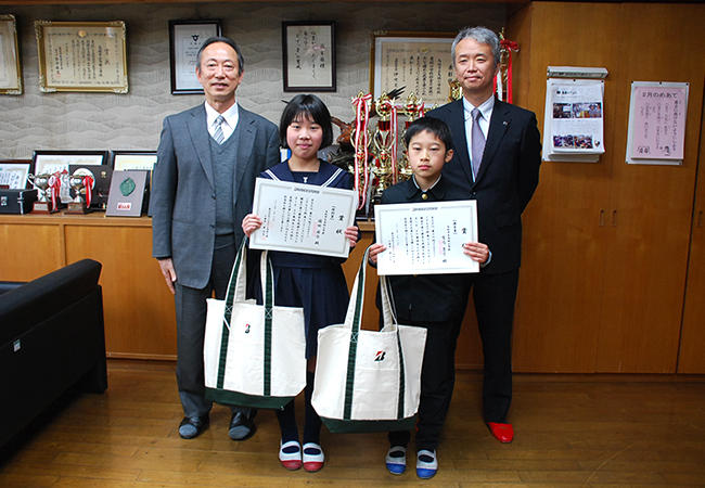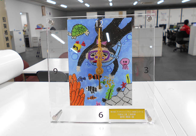久留米、鳥栖、甘木工場では、より多くの近隣地域の子どもたちに当コンクールへ参加頂くことを目的に、2016年より地域表彰を実施しています。具体的には、近隣の小学校や保育園・幼稚園を対象に、各工場による工場長賞等の賞を設定しています。今年は応募作品総数1,816点の中から「久留米工場長賞」、「鳥栖工場長賞」、「甘木工場長賞」各1点ずつを始めとする計30点の入賞作品を決定し、2月25日から3月7日にかけて各小学校にて表彰を行いました。受賞者には副賞として、受賞作品をプリントした置き時計等を贈呈しました。