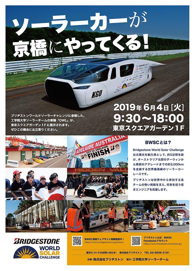 株式会社ブリヂストンは、世界最高峰のソーラーカーレース「Bridgestone World Solar Challenge(ブリヂストンワールドソーラーチャレンジ、以下BWSC)」に参戦したソーラーカーを2019年6月4日に東京スクエアガーデン(東京都中央区)で展示します。