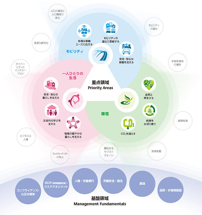 当社グループはグローバルCSR体系「Our Way to Serve」の中で、イノベーションと先進技術を通じて、人々がより快適に移動し、生活し、働き、そして楽しむことに貢献していくために、「モビリティ」「一人ひとりの生活」「環境」の3つの領域を「重点領域」としています。また、責任ある企業として欠かせない取り組みを「基盤領域」とし、調達や人権・労働慣行などの6つの領域においても先進的な活動を進めています。