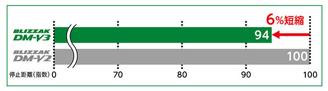 「BLIZZAK DM-V3」:12.15m、「BLIZZAK DM-V2」:13.31m、制動距離差:1.16m