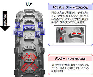 「E50 Extreme」は、2018年に発売した「BATTLECROSS E50」(以下、E50)をベースに、エンデューロレースの中でも、さらに厳しい地形が舞台のハードエンデューロレースに対応するため開発されたタイヤです。「E50」のリアタイヤのトレッドパタンを採用し、ソフトコンパウンドのトレッドゴムを搭載することで、ハードエンデューロレースに求められる力強いグリップ力と優れた操縦安定性を追求しています。