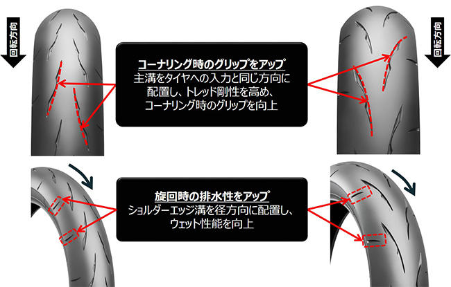 '80'sスーパーバイクレースは、欧州を中心として人気のある1980年代の旧車を使用した2輪レースです。「CR11」は、当社が長年の2輪レース用タイヤ開発で培った技術を投入した「RACING BATTLAX」直系のタイヤです。サーキット走行向けの2輪車用タイヤ「BATTLAX RACING R11」をベースに、パタンデザインやコンパウンドなどを最適化することで、'80'sスーパーバイクレースに求められる高いグリップ性能と操縦安定性の両立を追求しています。