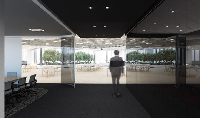 21Fオフィス内に多目的オープンスペースを設け、社内外から多様な方々をお招きして交流・共創を促進するプロジェクト・イベント・セミナー・講演会等を実施し、オープンイノベーションを加速していくとともに、1Fのショールームでは当社のブランドイメージ向上にむけ、当社のイノベーションとソリューションの活動を発信していきます。