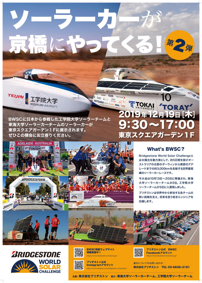 株式会社ブリヂストンは、本年10月にオーストラリアで開催された世界最高峰のソーラーカーレース「2019 Bridgestone World Solar Challenge(ブリヂストンワールドソーラーチャレンジ、以下BWSC)」に 国内から参戦した2チームのソーラーカーを、12月19日(木)に東京スクエアガーデン(東京都中央区)で展示します。