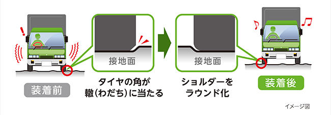 | パタン | 最適化したトレッド設計 | ショルダー部のラウンド化 | ・ワンダリング性 (操縦安定性)の向上 ・転がり抵抗の低減 |