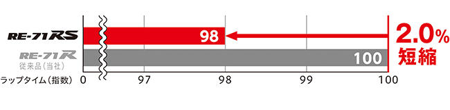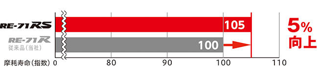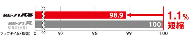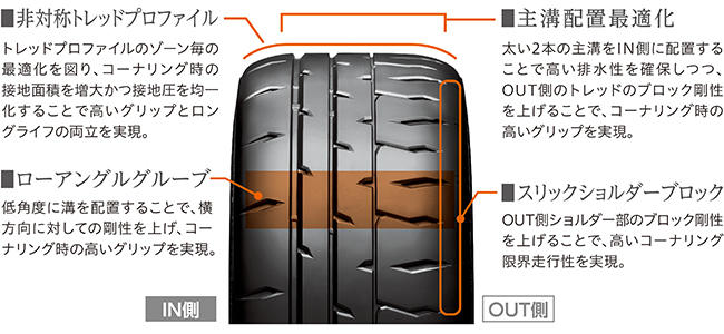 最適化した「非対称パタン」や「非対称形状」により、サーキット走行で重視されるドライ路面でのグリップ力とコントロール性を高次元で両立するだけでなく、ロングライフを実現しました。ご好評をいただいていた従来品※2と比べ、サーキット走行時の最速ラップタイムにて2.0%※3の短縮を実現し、摩耗寿命も5.0%※4向上しています。