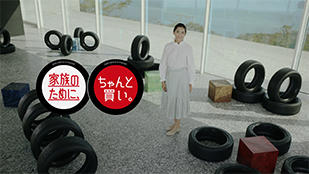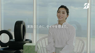 車で出かけた先に並べられた様々な種類のタイヤ。その1本1本に触れながら「音も静かで、安心感もあります。」と語ります。子供をもつ母親として、日々の送り迎えで感じることができた、ちょっとした安心感から、タイヤ選びの大切さについての気づきを表現しています。最後にインタビューカットとなり、「この実感が、ちゃんと買い。」で締めくくります。