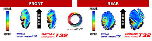 「BATTLAX SPORT TOURING T32」は、ウェット路面でのトラクションやブレーキ性能、コーナリンググリップを高めるため、「PULSE GROOVE(パルスグルーブ)」を採用しました。溝の形状を脈動形状にするとともに、ディフレクターを設置することで、水の流れを均一化し水の流れる速度が増すことで排水性を高め、従来品※1対比ウェット制動距離が7%短縮※2しています。また、当社独自技術「ULTIMAT EYE(アルティメット アイ)※3」により、接地面での粘着域を従来品対比増加したことに加え、リアタイヤでは接地面積を13%向上※4し、ドライやウェットなどさまざまな路面での接地感を高め、コーナリングでのグリップ性を向上しました。