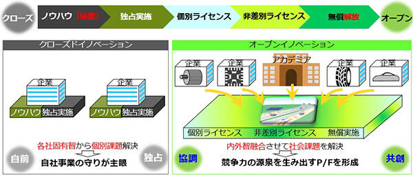 走行中給電の研究を社会実装するためには車両に搭載する部品の開発のみならず、給電設備や制御システムなど広範にわたる研究が必要です。本講座で扱う研究に関わらず研究開発への参加者を積極的に迎え、技術革新の基盤を築くことを目指し、オープンイノベーションによる研究を推進します。オープンイノベーションの枠組みや規約を作ることが試行的な要素を含むため、成功するオープンイノベーションの仕組みを構築します(図3)。