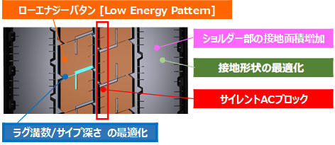 | パタン | ローエナジーパタン | ブロック形状を立体的に最適化することで、駆動時に発生するブロックの変形を低減 | ・耐偏摩耗性の確保 ・摩耗ライフの向上 |