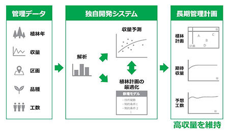 この最適化システムは、大学共同利用機関法人情報・システム研究機構 統計数理研究所の学術指導を経て、当社のゴム農園管理に関する知見に基づき土壌や病害予防といった複雑な制約を数理モデル化し、収量や面積といったパラゴムノキの農園から得られた膨大なデータに混合整数計画法※1を適用することで開発されたものです。このシステムを活用することにより、持続的に天然ゴムの高い生産性を確保するために「いつ」「どの品種を」「どの程度の量で」「どこに」植林すればよいかという情報の提供を可能にします。今後、実用面での課題抽出を経て、将来的に自社農園および他の農園に展開することを検討し、世界の天然ゴム生産の持続可能な安定供給に貢献したいと考えています。