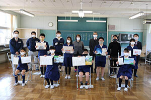 下関工場では、近隣地域のより多くの子どもたちに当コンクールへ参加いただくことを目的に、2011年より地域表彰を実施しています。近隣の小学校を対象に工場独自に「工場長賞」、「工場賞」を設定し、今年は応募作品総数206点の中から「工場長賞」4点、「工場賞」9点を決定し、3月22日、3月23日に受賞者の表彰を行いました。