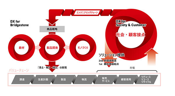 ブリヂストングループは、「2050年 サステナブルなソリューションカンパニーとして社会価値・顧客価値を持続的に提供している会社へ」というビジョンを掲げ、中期事業計画(2021-2023)において、独自のDXを推進しています。ブリヂストン流のDXは、これまで現場で長年培われてきた強い「リアル」に「デジタル」を組み合わせることで、「より大きなデータで、より早く、より容易に、より正確に」をテーマとして、断トツ商品・断トツソリューションの開発、展開に繋げることを目指しています。現場密着型の技術サービスにより得られた市場・顧客データや、経験則にもとづく実験・実証により培ってきた「ゴムを極める」技術などの強い「リアル」に、「デジタル」を加えることで、独自のシミュレ―ションやアルゴリズムなどを活用し、市場・顧客接点、素材~製品開発~モノづくり領域のバリューチェーン全体でイノベーションを加速することが可能となります。