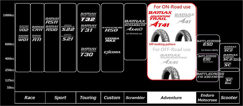 「BATTLAX」は、1983年の誕生以来、ライダーの皆様の様々なバイクライフを支える、ブリヂストンを代表する2輪車用タイヤブランドです。今回発売する新商品「BATTLAX ADVENTURE TRAIL AT41」は、アドベンチャー系バイクとのマッチングに配慮した、ブリヂストンの新しいアドベンチャーカテゴリーのタイヤです。オンロードタイヤでありながらもオフロードタイヤのような特徴的な見た目となっています。