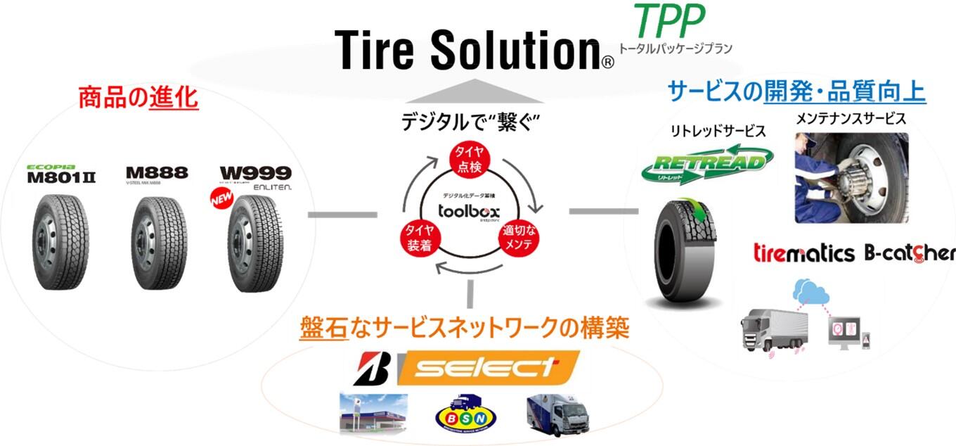 ブリヂストンのグループ会社であるブリヂストンタイヤソリューションジャパン株式会社は、日本全国へ展開を拡大している店舗ネットワーク「B-select」※1を活用し高度化する輸送事業者様のニーズに対応するためサブスクリプション型ソリューションサービス「トータルパッケージプラン(TPP)」※2のメニューを拡充・強化していきます。