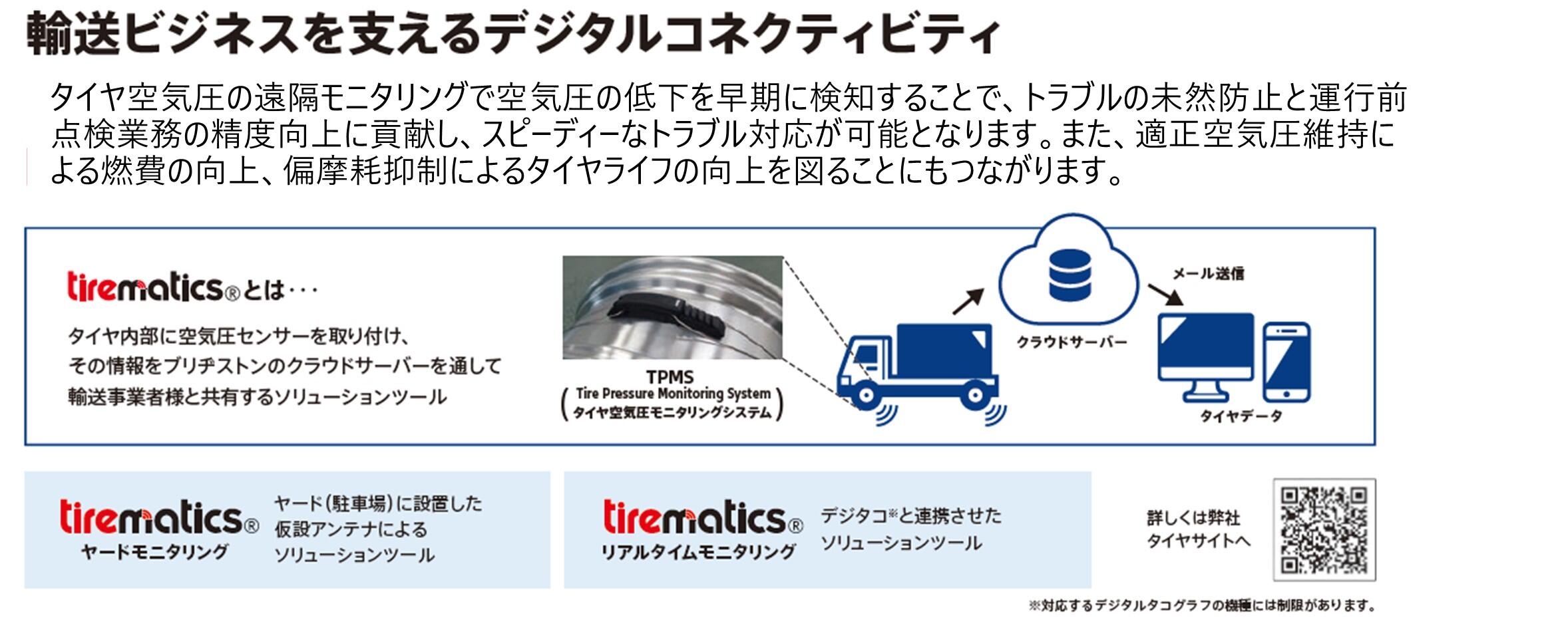 既に2021年よりサービス開始しているタイヤ空気圧を遠隔モニタリングする「Tirematics」※5に加え、今回新たに位置情報管理サービス「B-catcher」※5の提供を開始します。また、「TPP」を広くご活用いただけるような従量課金プラン※6もご準備しました。これらの拡充したメニューと従来からの、「リトレッドサービス」や安心・安全な運行を支える高品質な「タイヤメンテナンス」、「ブリヂストンサービスネットワーク(BSN)」※5を組み合わせることで、リアルとデジタルの両面からお客様の足元を支えていきます。今後も環境変化に合わせお客様のサステナブルな事業運営に貢献すべく、新たなメニュー開発や品質を向上していきます。