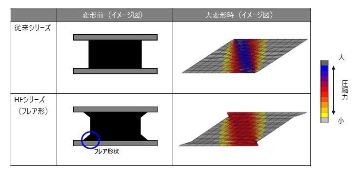 同サイズの当社従来シリーズとHFシリーズ(フレア形)の免震ゴムの比較イメージ図