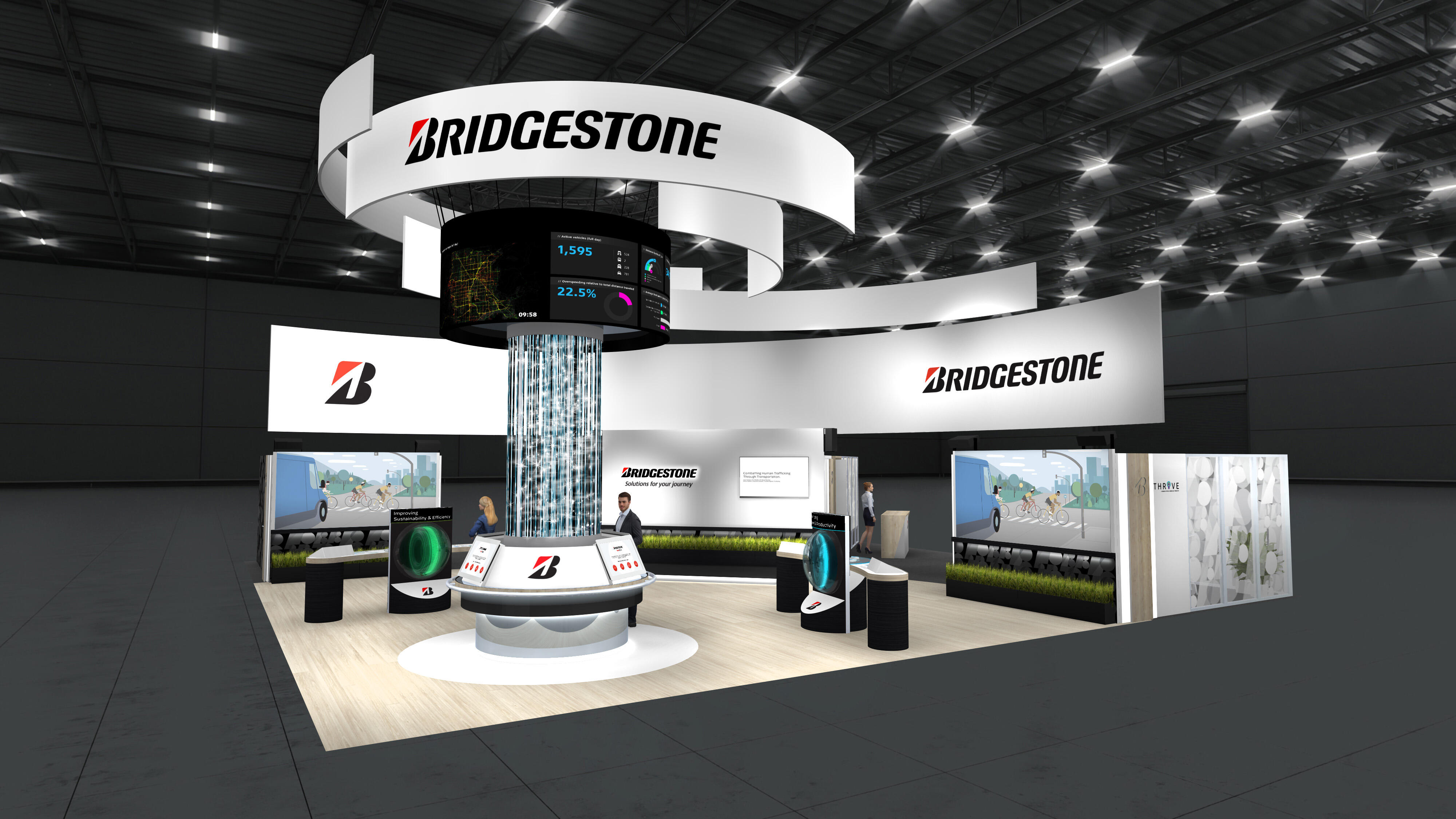 ブリヂストンのブースは、"新たなプレミアム"を創造するプレミアム事業・ソリューション事業へフォーカスする活動、サステナブルなグローバルモータースポーツ活動について、映像や双方向で楽しめる構成としています。