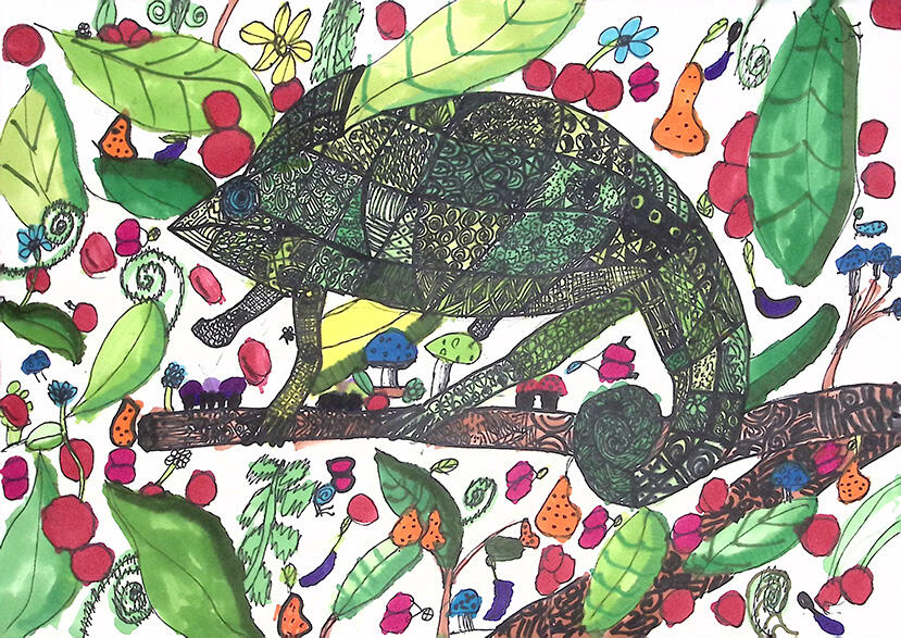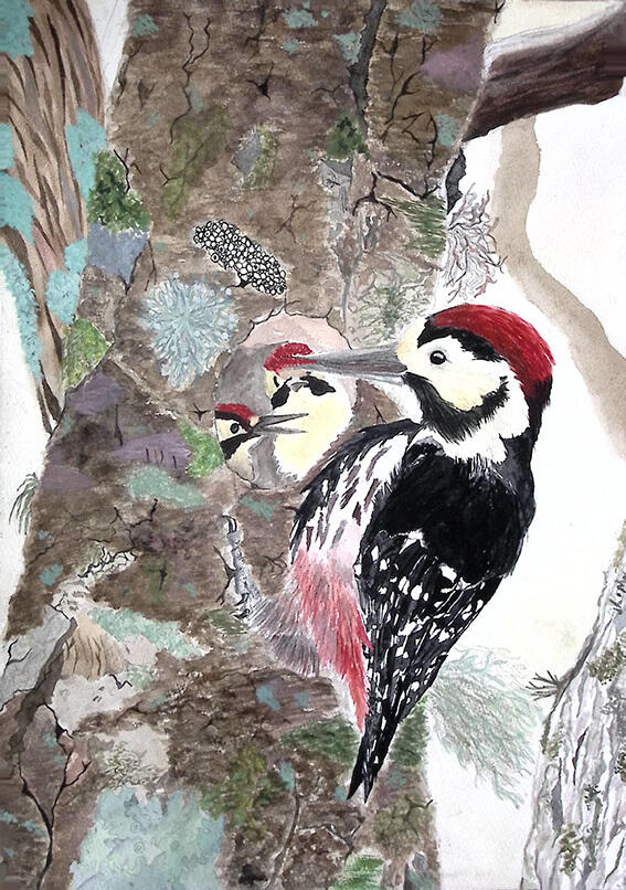 私は森や山の中でいつも見ているけれど気にしていなかったコケや地衣類に目を向けてみた。この植物があるから自然が成り立って生き物が生活している。その様子を絵にかいた。