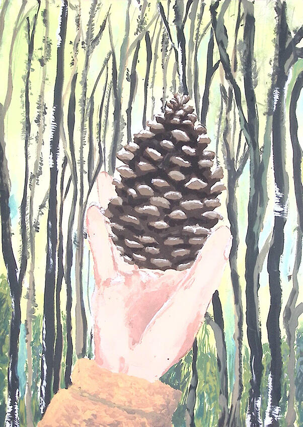 森を散歩している時に、大きなまつぼっくりをひろいとてもうれしかった。森の中には、紅葉した葉、どんぐり、小枝、宝物でいっぱい。自然を大切にして、いつまでもきれいな森を守りたい。