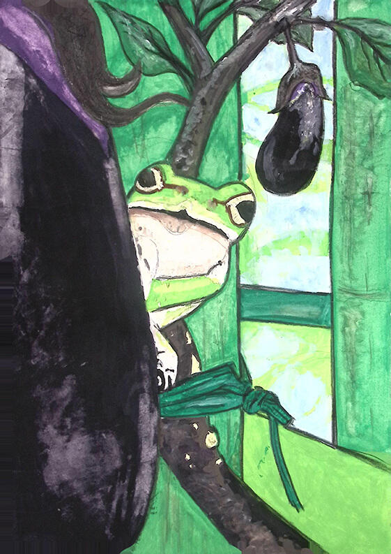 家の庭のプランターで作っているナスからカエルがひょっこり顔を出していたのがとてもかわいくて、身近な所にカエルも生きていることを知ってうれしかったから。