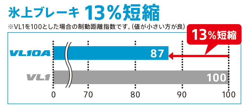 今回発売するスタッドレスタイヤ「BLIZZAK VL10A」は、ブリヂストンの独自技術である「発泡ゴム」※2を進化させた「LT専用ブイエル発泡ゴム」を採用し、従来品「BLIZZAK VL1」(ブリザック ブイエルワン)対比氷上ブレーキ性能を13%向上しています※3。この発泡ゴムは、2022年に発売した「BLIZZAK VL10」にて新たに採用されたもので、その性能に好評を頂いています。また、接地面積アップとブロック剛性向上を両立し、ブロック変形を抑制することで、従来品対比摩耗ライフを14%向上しており※3、資源生産性の向上やタイヤメンテナンス工数の削減に貢献します。