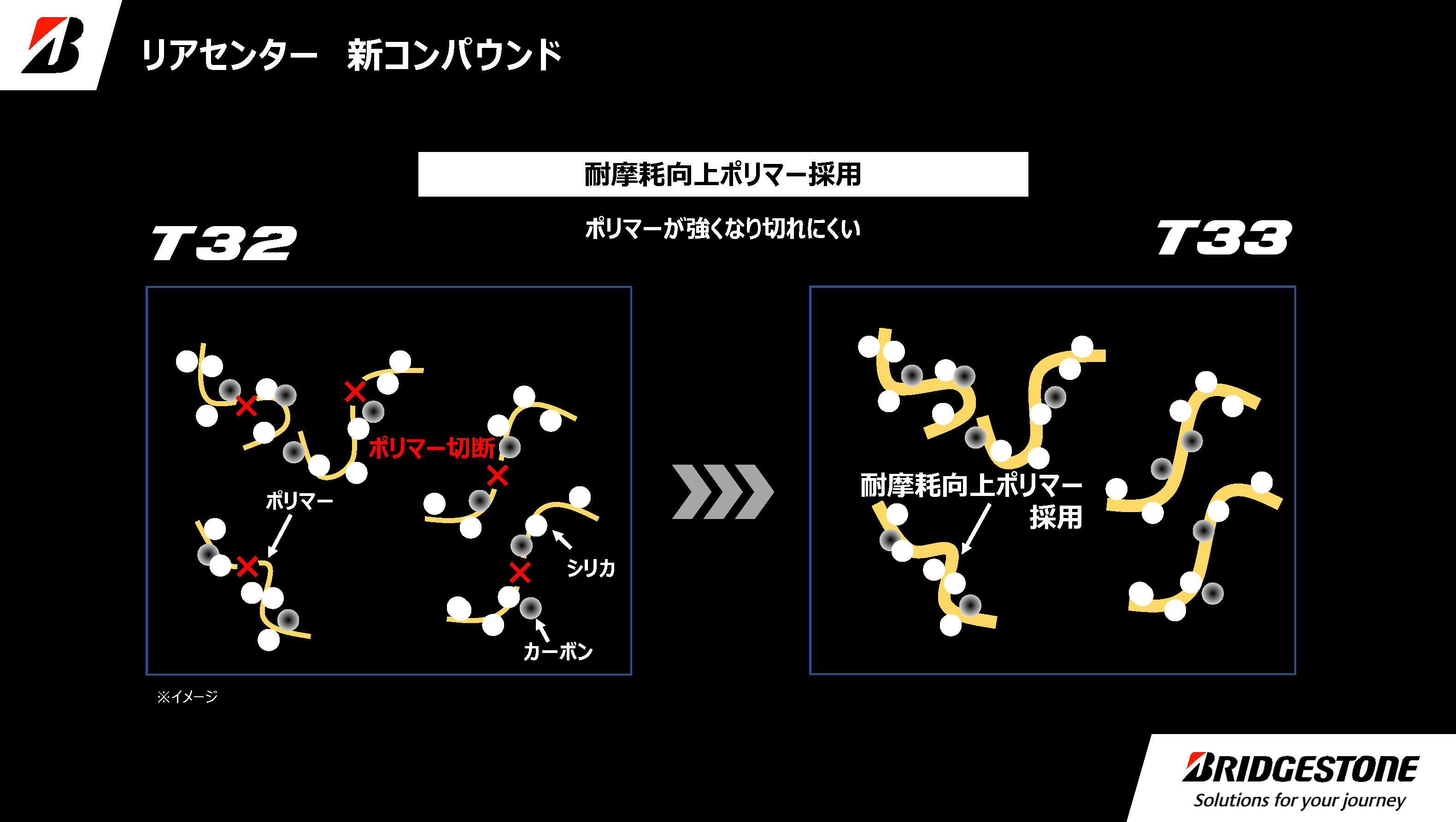 今回発売する「BATTLAX SPORT TOURING T33」は、従来品「BATTLAX SPORT TOURING T32」(バトラックス スポーツ ツーリング ティーサンニー)からツーリング走行に必要な性能を維持しながら、摩耗ライフを47%向上させた次世代のスポーツツーリングタイヤです。新設計のコンパウンドを採用し、トレッドパタンと構造を最適化することで、摩耗ライフの向上と安心感のあるハンドリング性能を両立しています。これにより、不安のない長距離ライディングを実現し、ツーリングの楽しみを足元から支えます。※1