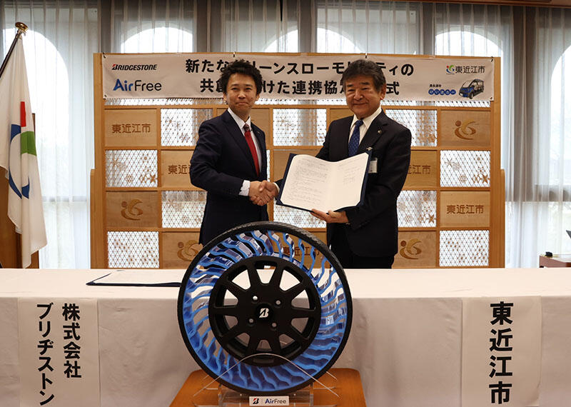 滋賀県東近江市(以下、東近江市)と株式会社ブリヂストン(以下、ブリヂストン)は、道の駅「奥永源寺渓流の里」を拠点とした自動運転サービスに関する連携協定を2025年1月15日に締結しました。本協定は、東近江市が運営するグリーンスローモビリティの自動運転サービスに、ブリヂストンの空気充填が要らない次世代タイヤ「AirFree」※1を装着し、その特性や機能、提供価値を検証するとともに、地域社会のモビリティを支えるための連携及び協力を目的としています。