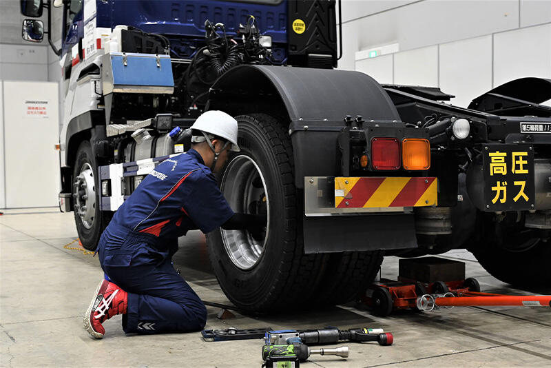 ブリヂストングループは、輸送事業者様の安全運行を確保するために独自のトラック・バス用タイヤの作業標準を策定・展開し、高いサービス品質の維持・向上に継続的に取り組んでいます。本競技会は、タイヤメンテナンスに携わるメンテナンススタッフの重要な育成活動の一つです。本年は全国のブリヂストングループおよび関連のトラック・バス用タイヤ販売店から344名が地区予選に出場し、予選を勝ち抜いた代表選手40名が、全国大会においてタイヤメンテナンスの作業スキルやお客様へのアドバイス力を実作業形式で競いました。
