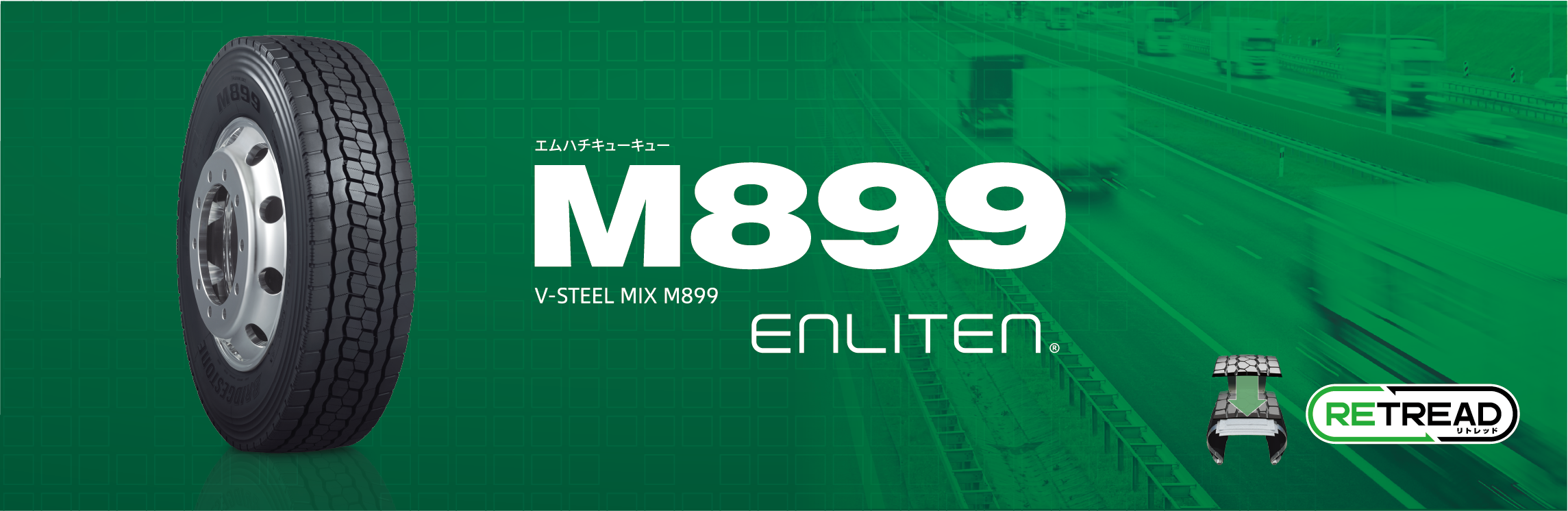 「M899」はトラック・バス用オールシーズンタイヤで初めて商品設計基盤技術「ENLITEN®」※4を搭載することにより、新品でのライフ性能だけでなくリトレッド※5を含めたトータルでのライフを向上、加えて、耐偏摩耗性・ウェット性能を車型に応じてエッジを効かせることで、お客様の経済性/安全性と環境性能を高次元で両立しています。リトレッドと連携し、タイヤ一本一本を使い切ることでタイヤ一本当たりの価値を最大化し、サーキュラーエコノミーの実現へ貢献することをコンセプトとしてデザインされています。