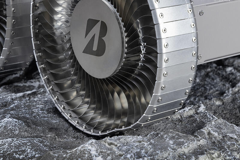ブリヂストンが展示予定のモビリティに装着された月面探査車用タイヤのコンセプトモデル