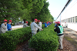 こうした努力が認められて、甘木工場は1985年に「緑化推進運動功労者」として総理大臣賞を受賞しています。また、甘木工場が立地する朝倉市は「ほたるの里」として知られていることもあり、工場敷地内の雨水調整池を活用し、ほたるが生息できるビオトープを2008年に開設しました。地域の皆様と共にほたるの成長を実際に鑑賞する機会を設け、地域の自然環境へさらに関心をもっていただくきっかけづくりにも努めています。また工場内にはお茶の木が植えられており、毎年5月に従業員で茶摘みを行い、新茶を周辺地域の福祉施設の皆様にも味わっていただいています。