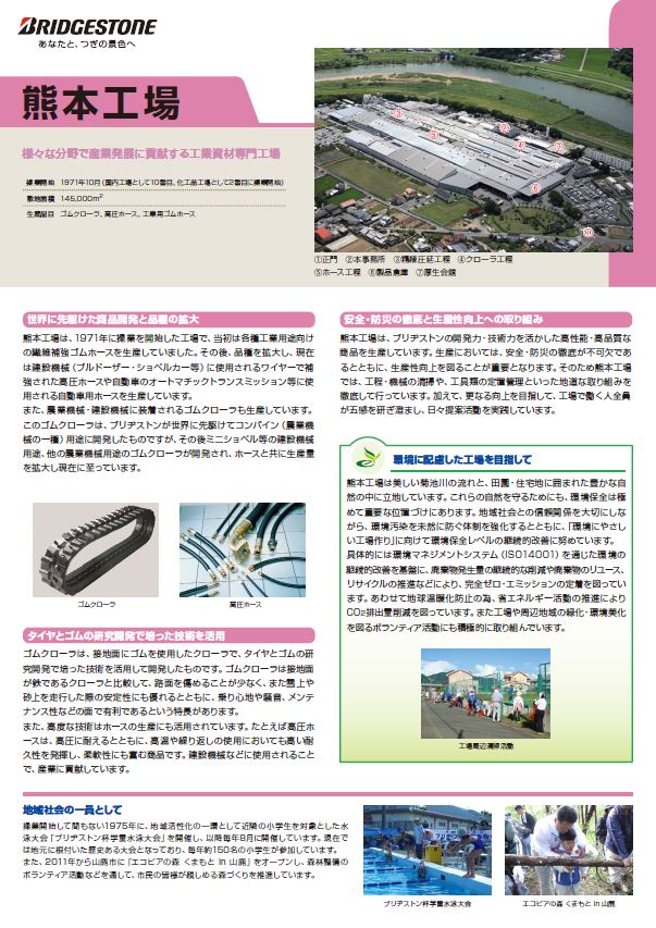 熊本工場は、1971年に操業を開始した工場で、当初は各種工業用途向けの繊維補強ゴムホースを生産していました。その後、品種を拡大し、現在は建設機械(ブルドーザー・ショベルカー等)に使用されるワイヤーで補強された高圧ホースや自動車のオートマチックトランスミッション等に使用される自動車用ホースを生産しています。