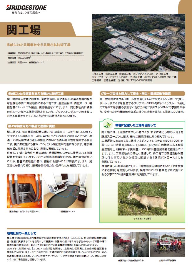 関工場は周辺を緑に囲まれ、東に木曽川、西に長良川の清流を臨む静かな丘陵地の関工業団地内にある工場です。生産品目は、高圧ホース、樹脂配管といったゴム製品、樹脂製品などです。また、同じ敷地内に複数のグループ会社工場が併設されており、ブリヂストングループの多岐にわたる事業を支えていることが大きな特徴となっています。