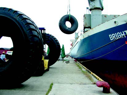 下関工場で生産されるタイヤは非常に大型であるため、トラックなどによる陸上輸送が困難です。また、ここで生産されたタイヤのほとんどは海外(アメリカ、オーストラリア、中南米、アフリカなど)に輸出されています。そのため、下関工場は港に隣接する立地となっており、製品の大半は工場から直接船積みされ、輸出されています。