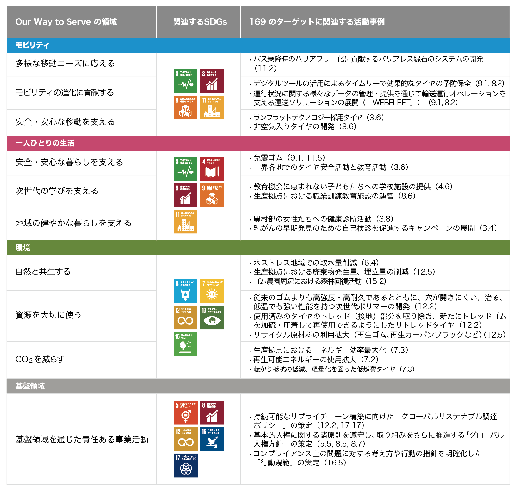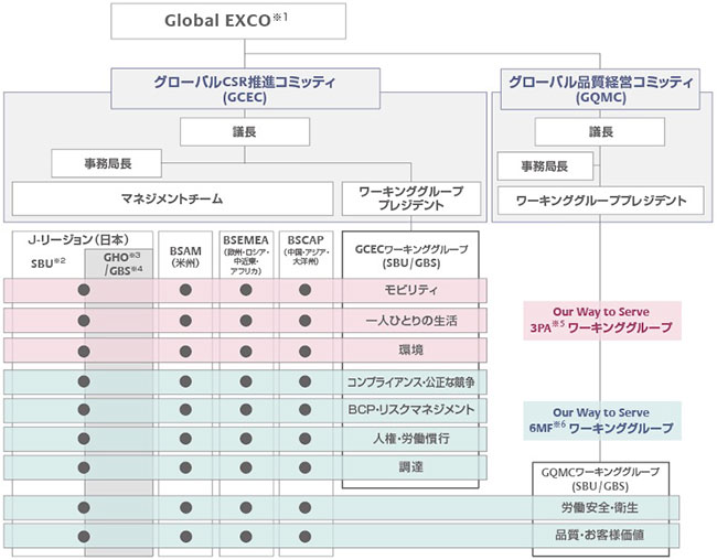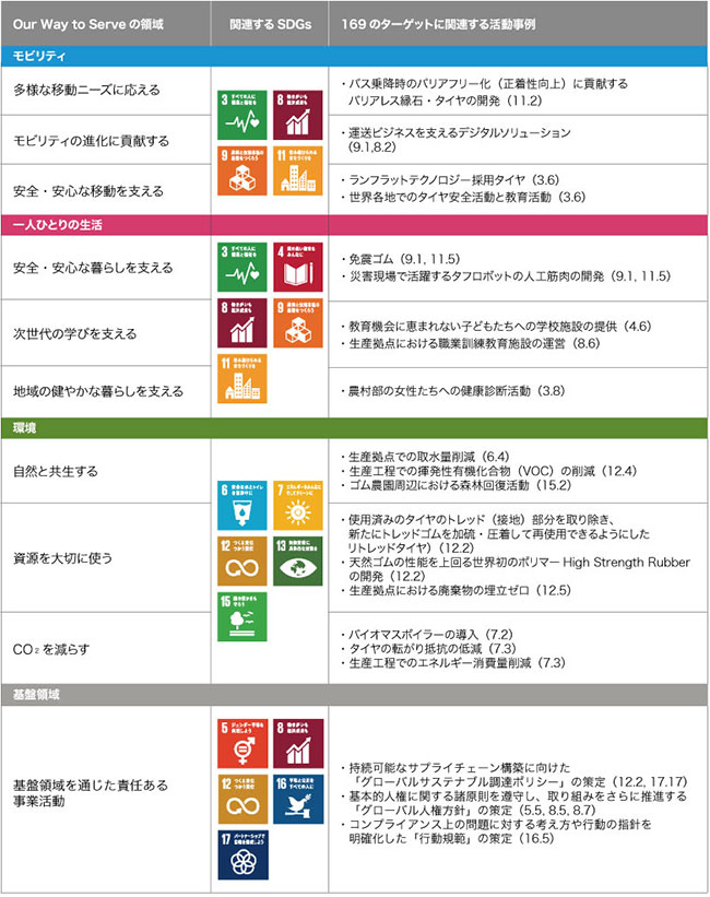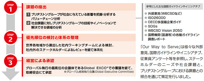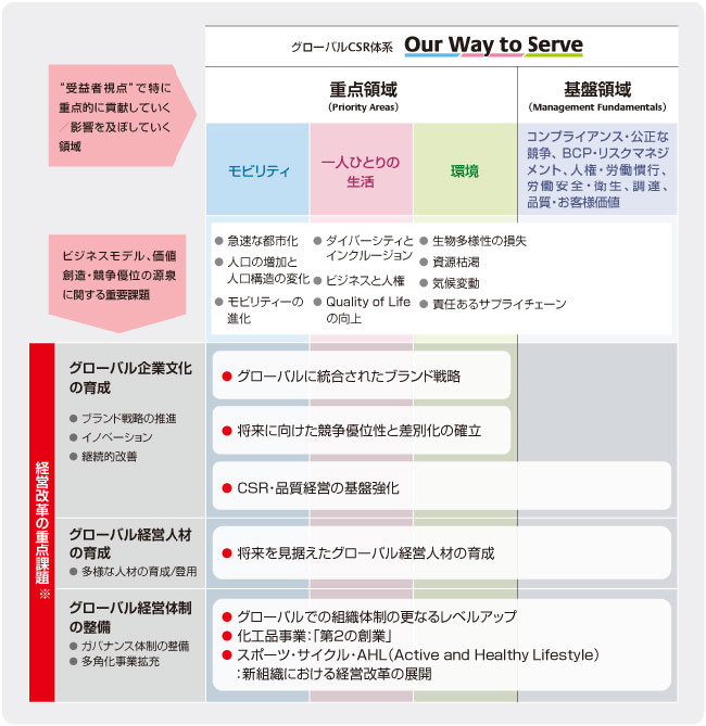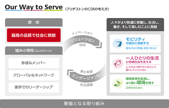 ブリヂストングループは、使命を具現化し、グローバルで軸がぶれないCSR活動を推進するための「共通言語」として、2007年にCSR「22の課題」を設定しました。「CSRは経営そのもの」という考え方のもと、環境保全や品質、安全など企業活動の根幹となる22の取り組みをグローバル共通の経営課題として中期計画に織り込み推進することで、CSR活動の基盤を構築することができました。そうして築き上げたものを礎として、グローバル企業として社会期待に応え、よりよい社会の実現に貢献していくための指針として2017年にグローバルCSR体系「Our Way to Serve」を策定し、「モビリティ」「一人ひとりの生活」「環境」を3つの重点領域として特定することで、グローバルで整合性を取りつつ各地域が主導する「グローカル(グローバル×ローカル)」なアプローチで活動を進化させてきました。
