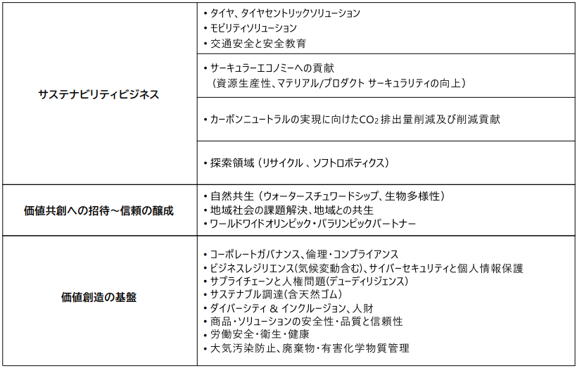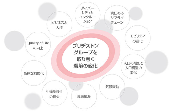 社会の変化を先取りし、変化をチャンスに変え、事業活動・社会貢献活動を通じて、持続可能な社会の実現に貢献することは、「最高の品質で社会に貢献」を使命とする当社グループの果たすべき役割・責任だと考えています。また、当社グループ自身の持続的な成長のためにも、社会価値と顧客価値の創出を両立させ、社会、お客様、ブリヂストンが共にWin-Win-Winとなる「サステナビリティビジネス構想」の実現を目指して挑戦を続けます。