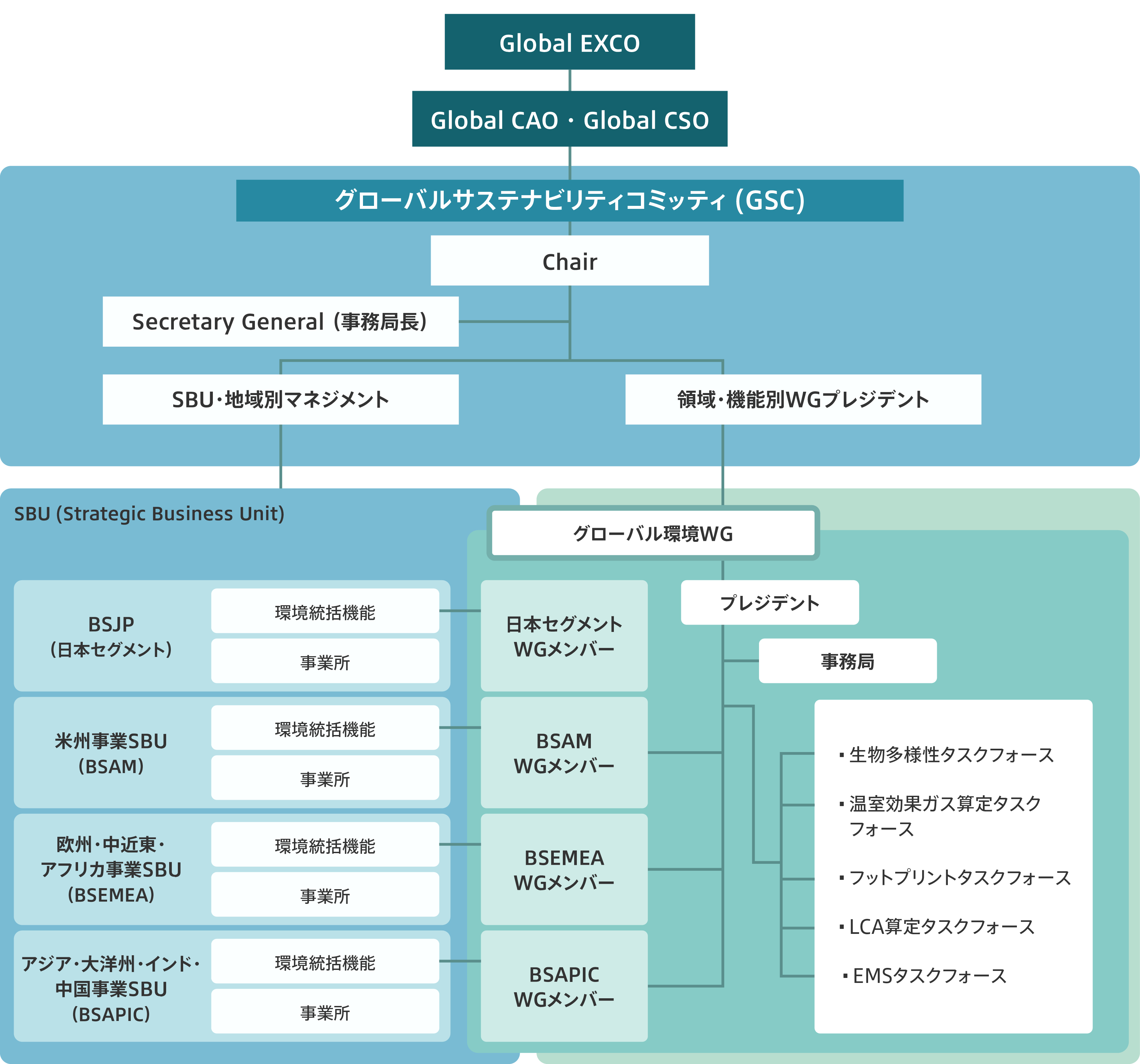ブリヂストンでは、中期事業計画に沿ってTEAMSの活動を強化するために、GSCとグローバル環境ワーキンググループ(WG)、戦略的事業ユニット(SBU)の3つの組織が調整・協力していくグローバル環境マネジメント体制をとっています。気候変動、サーキュラーエコノミー、自然関連課題といったサステナビリティに関する中期事業計画関連のグループ全体の環境戦略や方針は、GSCの会議で議論されています。活動の進捗状況やその他の課題は、グローバル環境WGとGSCが取りまとめと検証を行い、Global CAO・Global CSO統括のもと、1年に4度開催されるグローバル経営執行会議(Global EXCO)に報告されます。Global EXCOでの議論の結果は、取締役会にも提出され、承認された戦略や方針は、各SBUが環境マネジメントシステム(EMS)を通して実践します。