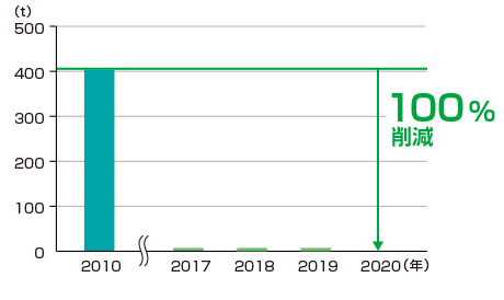 ブリヂストンは、揮発性有機化合物(VOC)や鉛など環境負荷が懸念される化学物質の代替物への切り替えを進めるとともに、継続的に使用量削減にも取り組んでいます。例として、ゴムと金属を接着させる接着剤に含まれているテトラクロロエチレンについては、代替品への切り替えを実施し、2008年に全廃しました。鉛については、スチールコード工場で鉛を全く使用しない製造方法を開発して全廃し、化工品工場においても接着剤の切り替えを実施し、大幅な削減を達成しています。 今後も新たな目標を設定し、さらなる削減を進めていきます。